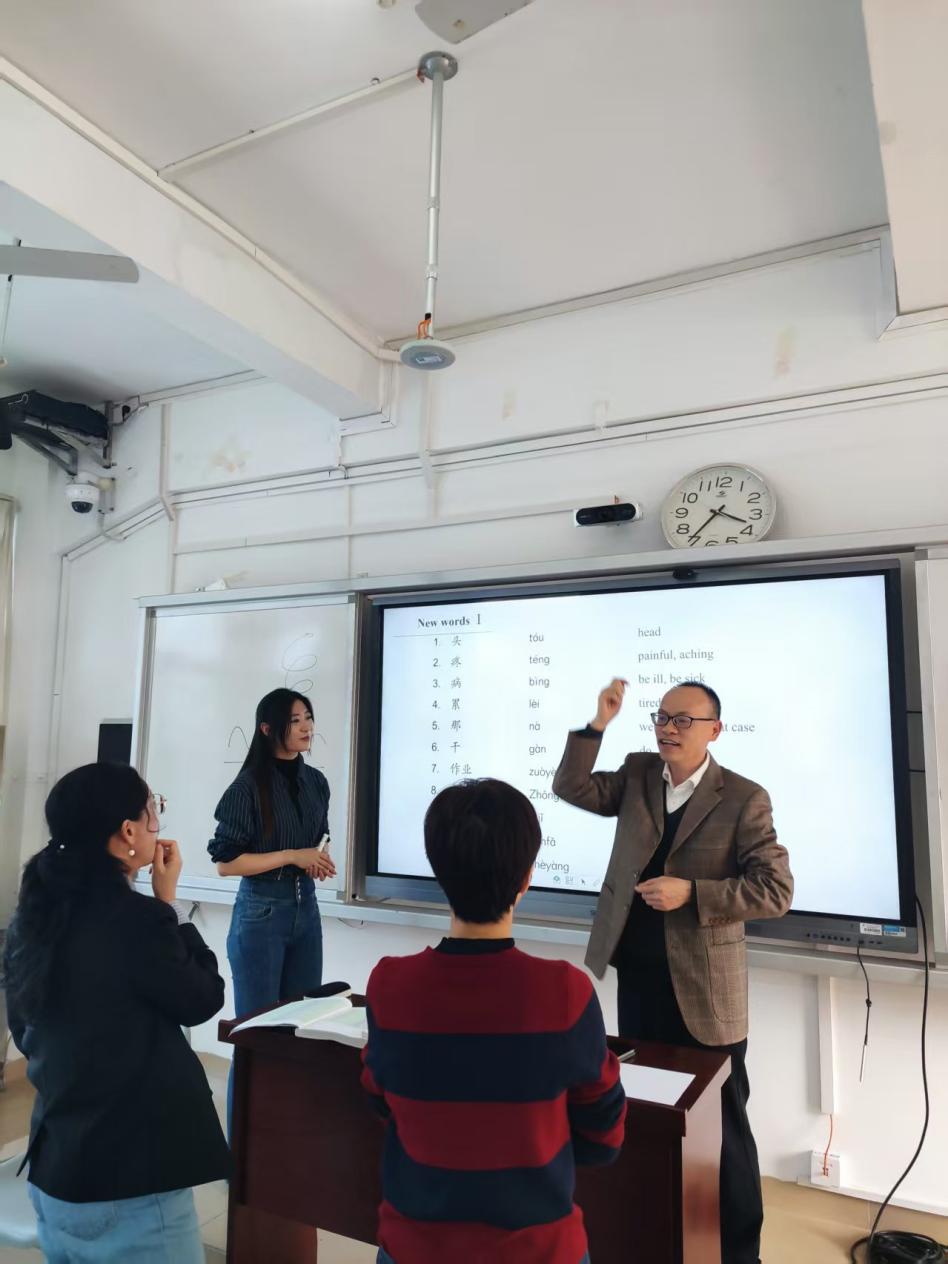 本次活动从教材分析、课件制作和课堂教学等方面,研讨如何上好初级汉语口语课。罗志敏老师首先以初级汉语口语课为例,展示了个人的课件,并进行了说课和试讲。我院三位教学督导针对罗老师的试讲,从教学重点的选择、课件的设计和教学方法的灵活运用三个方面展开进行指导。各位督导明确提出,口语课必须配合综合课的进度,口语课的语法操练不能脱离综合课相应阶段的重点内容。关于课件设计,督导们对内容的准确性、生动性不仅提出了要求,而且还现场展示了如何处理生词的课件,如何在充分评估留学生学习个性特点的基础上,选择跟教学内容适配度高的方法。除了口头交流,各位督导走上讲台,以具体的生词教学为例,向年轻教师示范不同的教学方法如何在留学生课堂上有效地使用。在活动的最后,罗老师向督导们表示感谢,并总结了磨课的心得和教学改进策略;各位教学督导也祝愿年轻老师能够在教学过程中快速成长,为我院留学生课堂打造更多精品课程。