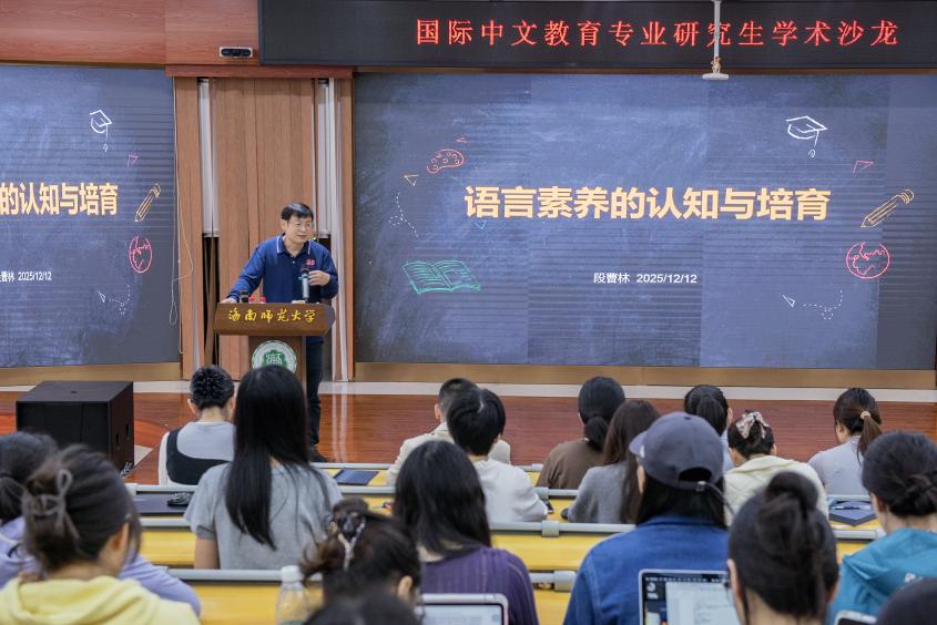 12月12日上午,国际教育学院第十六期研究生学术沙龙于学院201报告厅顺利举办。本次活动特邀我校文学院段曹林教授担任主讲嘉宾,以“语言素养的认知与培育”为题展开深入讲解。活动由国际教育学院研究生会承办,副院长张恒主持,学院全体硕士研究生参加。