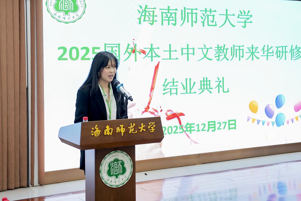 来自印度尼西亚的廖怡娜老师作为优秀学员代表上台发言,她首先感谢星空免费版app对本次研修培训班的精心筹备以及所有授课专家的倾囊相授。其表示本次研修之旅远超她的预期,课程内容具有很强的实用性,授课老师深挖教学根本问题,帮助学员们打磨专业能力,用新的教学理念、教学方法为学员们的教学工作赋能,让她获得了很多教学法宝,好似打开了一扇中文教育世界的新大门。通过参与本次研修收获的知识、友谊和领悟,将成为她教学生涯的珍贵礼物。并表示她将学以致用,回国后把所学所悟应用到课堂上,努力用更加生动的中文课堂,让更多的海外学子爱上中文,爱上中国文化,搭建更多沟通理解的桥梁。